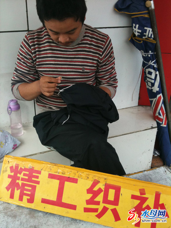 在南大街附近,記者發現了個織補攤,攤主是夫婦兩人,雖然身邊是車輪滾滾,但倆人就那么低著頭,認真地飛針走線。